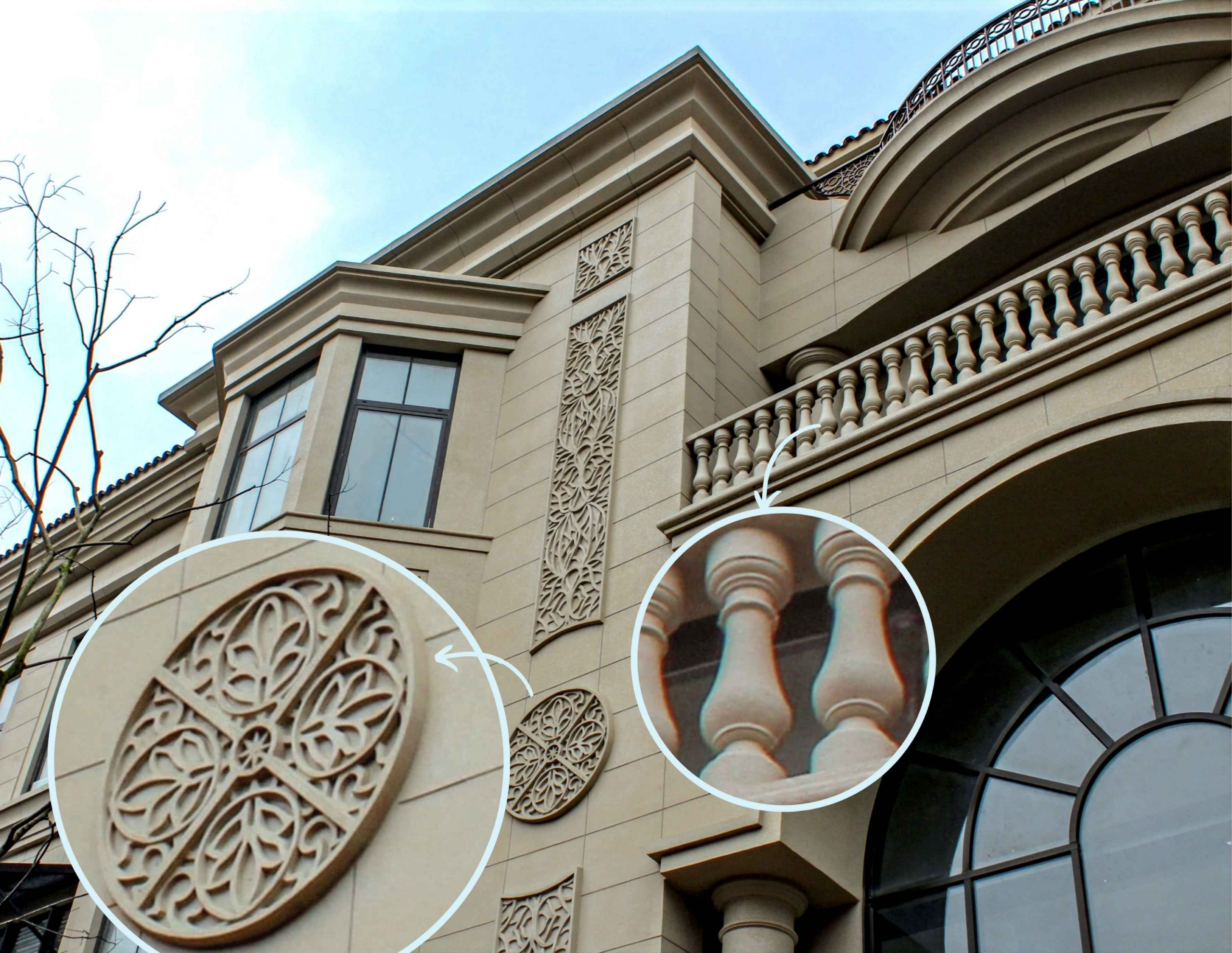 Recreate classic cornices, columns, window frames, and medallions at a fraction of the cost. By combining Dove Multicolor Stone paints with lightweight styrofoam and GRC profiles, you can achieve the depth and shadow of traditional stone carving without the heavy weight burden on the structure.