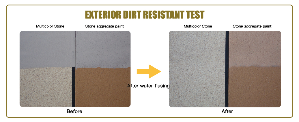 Carbon powder is being dusted on both multicolor stone and stone aggregate paint, after rinsing with water, results shows that Multicolor Stone is more dirt resistant than stone aggregate paint.