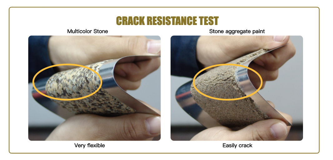 Multicolor Stone is highly flexible and can effectively cover wall cracks. Traditional stone aggregate paint is rigid and prone to cracking in outdoor environments, failing to conceal underlying wall imperfections. Our flexible formulation adapts to structural movements, preventing cracks from appearing on the surface.