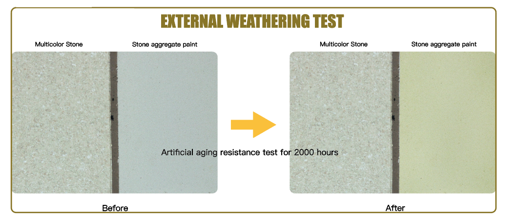Multicolor Stone has undergone a 2000 hour (equivalent to 20 year outdoor) aging test. Results show that Multicolor Stone does not powder or yellow. Unlike Stone Aggregate Paint after testing will powder and yellow